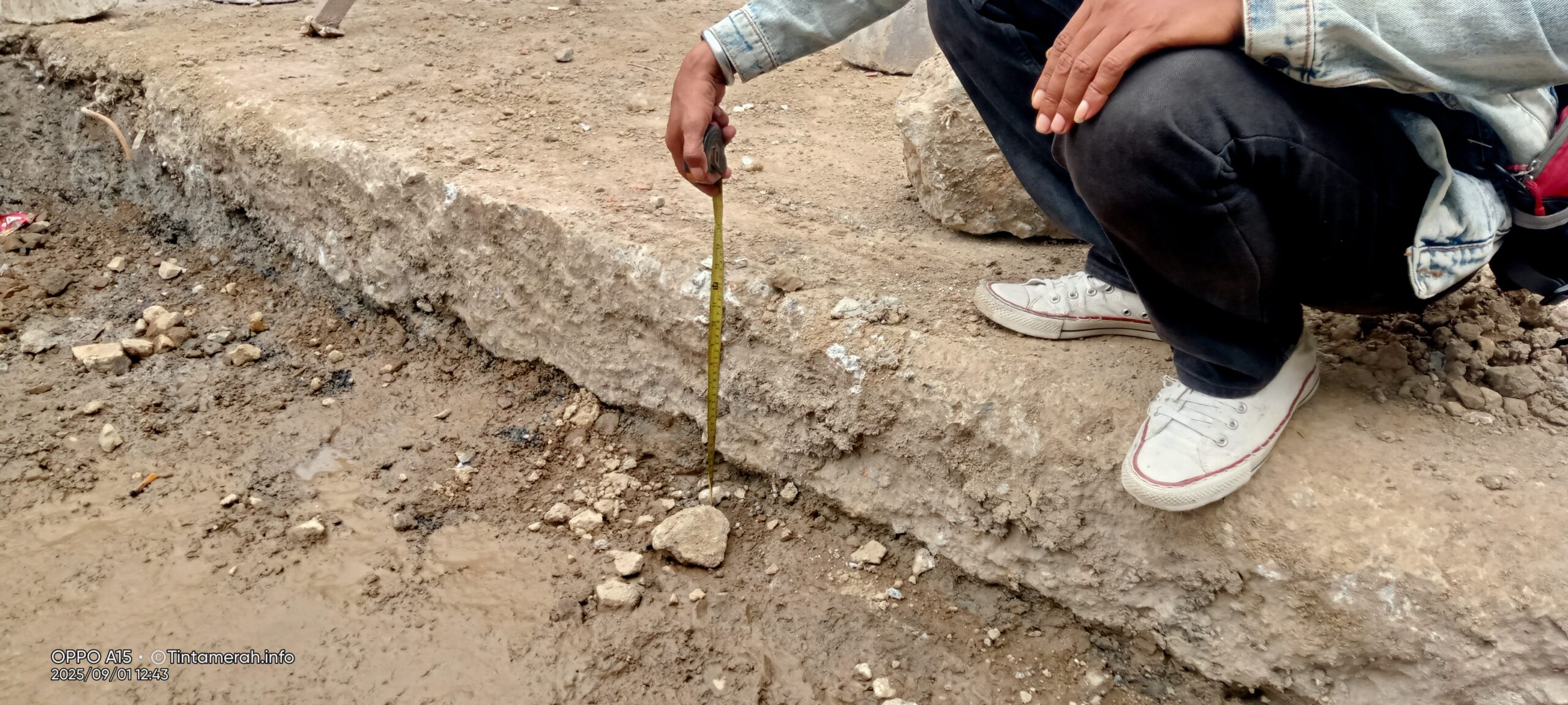 “dari kegiatan pengupasan jalan yang di awali pembobokan seluruh ruang badan jalan yang lebarnya sekitar enam meter,